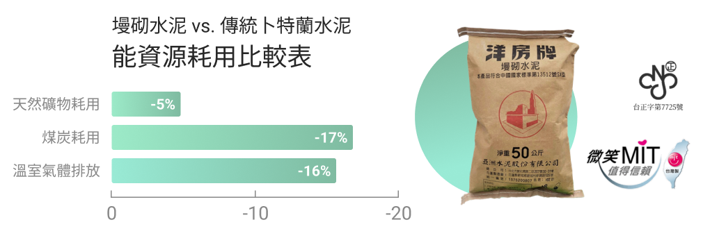 每噸墁砌水泥相較於傳統卜特蘭水泥可減少16%溫室氣體排放,並各節約5%及17%天然礦物及煤炭耗用。同時,墁砌水泥成分包含特殊性能藥劑,在品質上更勝於傳統水泥,有優異的工作性及抗裂能力,為兼具環保性能及高品質的低碳水泥產品。