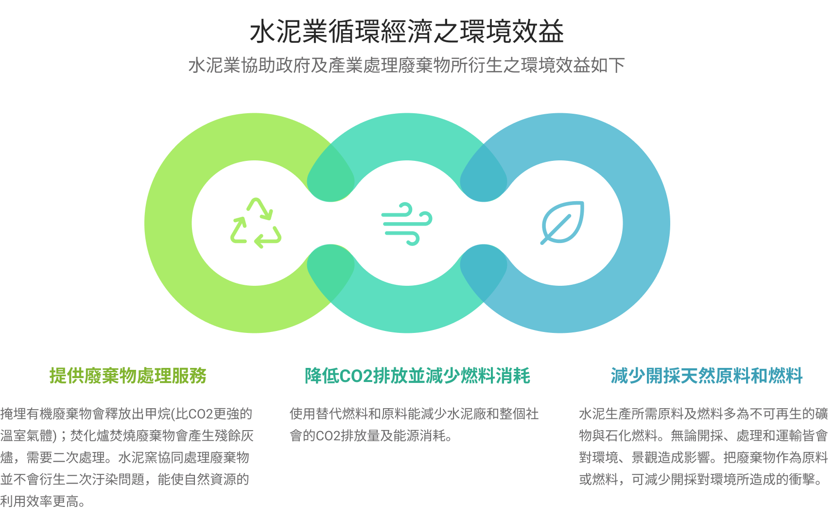 利用水泥旋窯高溫製程的特性,將廢棄物回收再利用,轉化成為寶貴的資源,同時也具有顯著的減碳成效。