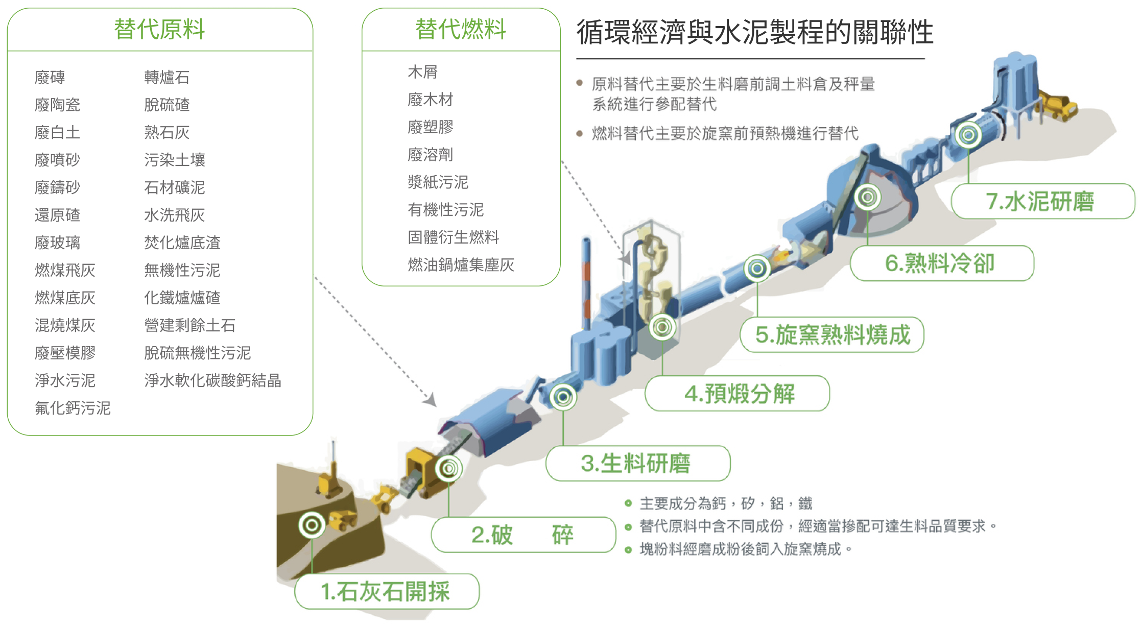 政府部門及半導體、石化、石材、光電、自來水、造紙、紡織、發電、封裝與鋼鐵等行業所產生的事業廢棄物,經由水泥廠檢驗評估後,可作為水泥製造的替代原料或燃料。